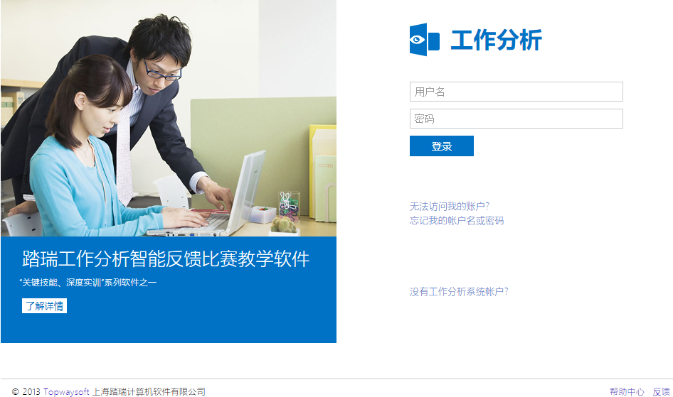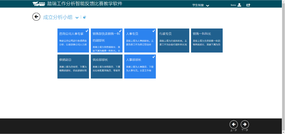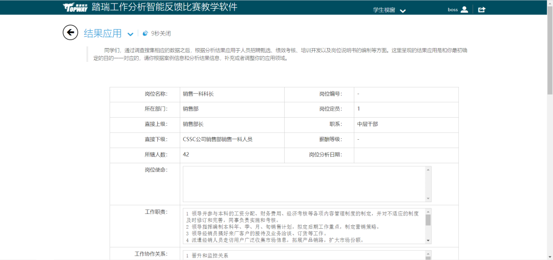 踏瑞工作分析智能反饋比賽教學軟件,包括工作分析的一般過程、問卷法、任務清單法、關鍵事件法、勝任力素質模型和工作說明書編制等內容。在每一具體的實驗流程中,軟件時刻秉承“所見即所得”的指導思想,在具體內容上積極探索情景模擬再現和多樣化的參與方式,在視頻、選擇和問答等傳統形式的基礎上探索了使用拖曳、flash和判斷等的新形式。