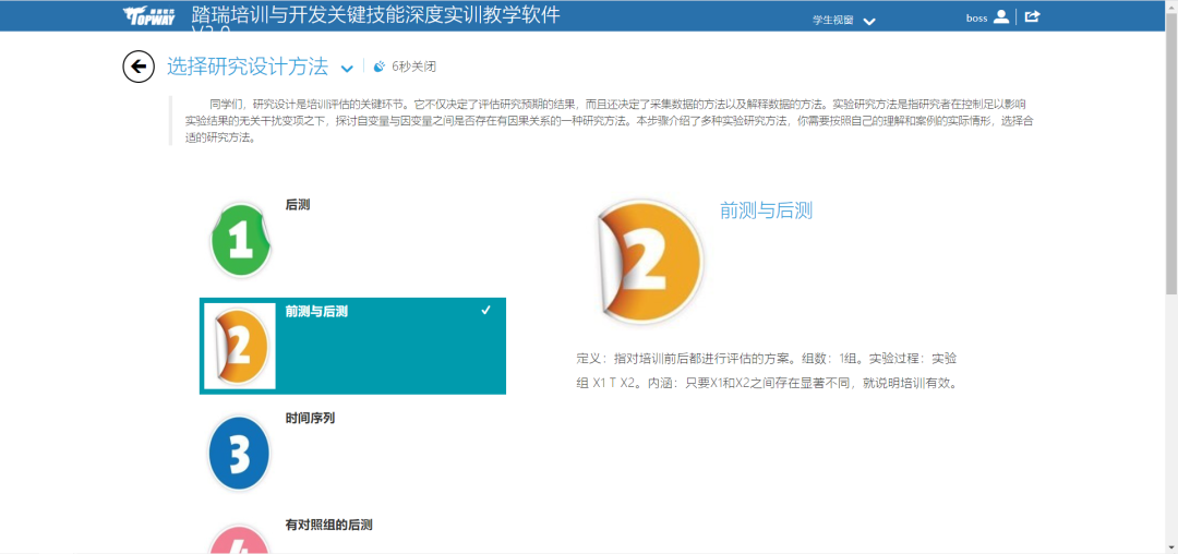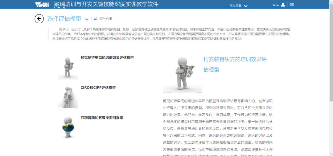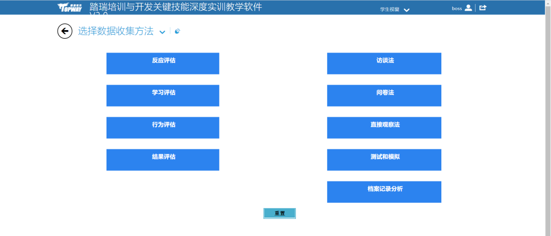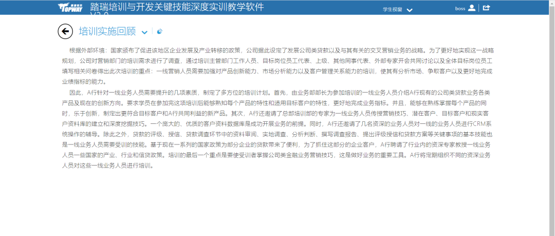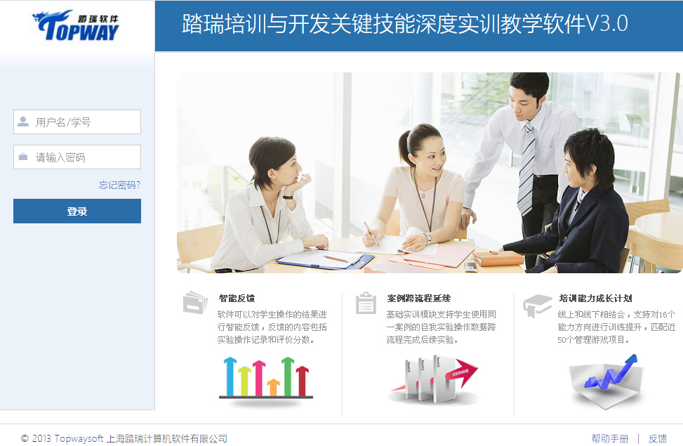 踏瑞培訓與開發智能反饋比賽教學軟件,包括培訓需求分析、培訓項目設計與實施、培訓效果評估、基于勝任力素質的培訓需求分析、培訓能力成長計劃和培訓項目庫等內容。在每一具體的實驗流程中,軟件時刻秉承“所見即所得”的指導思想,在具體內容上積極探索情景模擬再現和多樣化的參與方式,在視頻、選擇和問答等傳統形式的基礎上探索了使用拖曳、flash和判斷等的新形式。